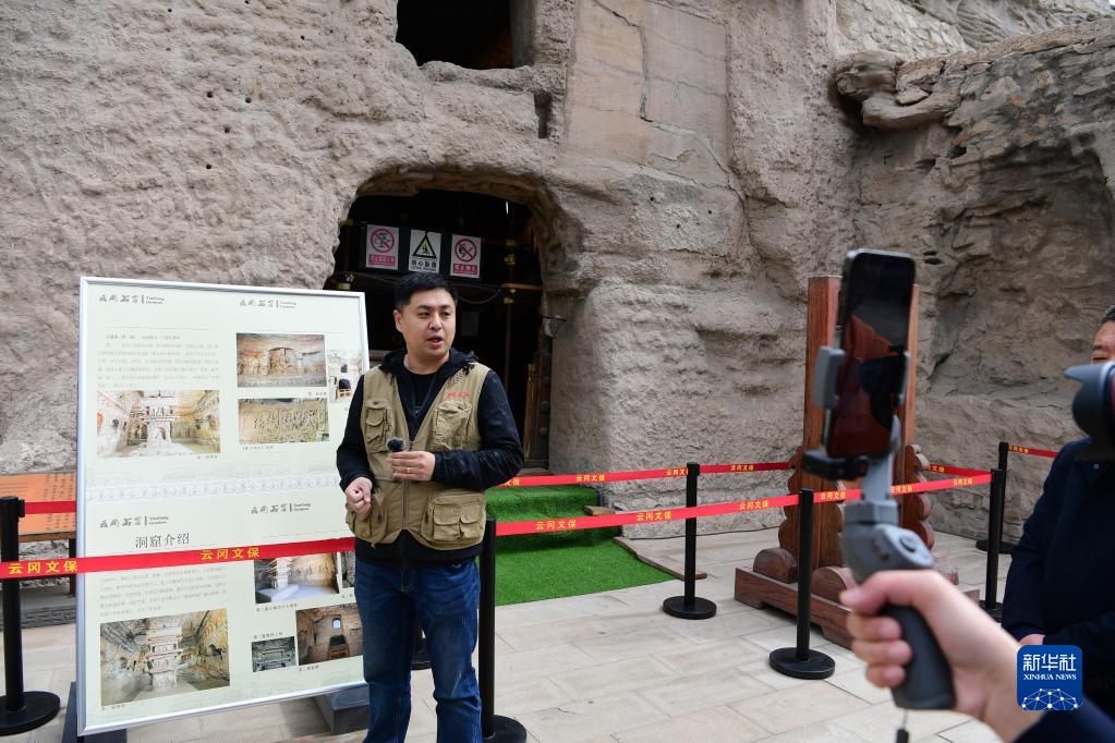 5月11日,云冈研究院工作人员孙波在云冈石窟第1窟进行文物保护专题直播。新华社记者 杨晨光 摄